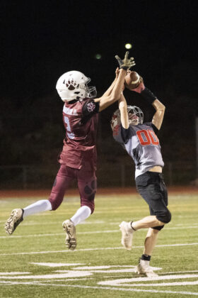 Marauders Crosby Westcott (no. 5) attempts to catch a pass while Coyotes Kayden Dubs (no. 0) pressures him during the Northern Arizona Youth Football Majors championship between Camp Verde Coyotes and Mingus Mountain Marauders at Sedona Red Rock High School on Saturday, Nov. 8.