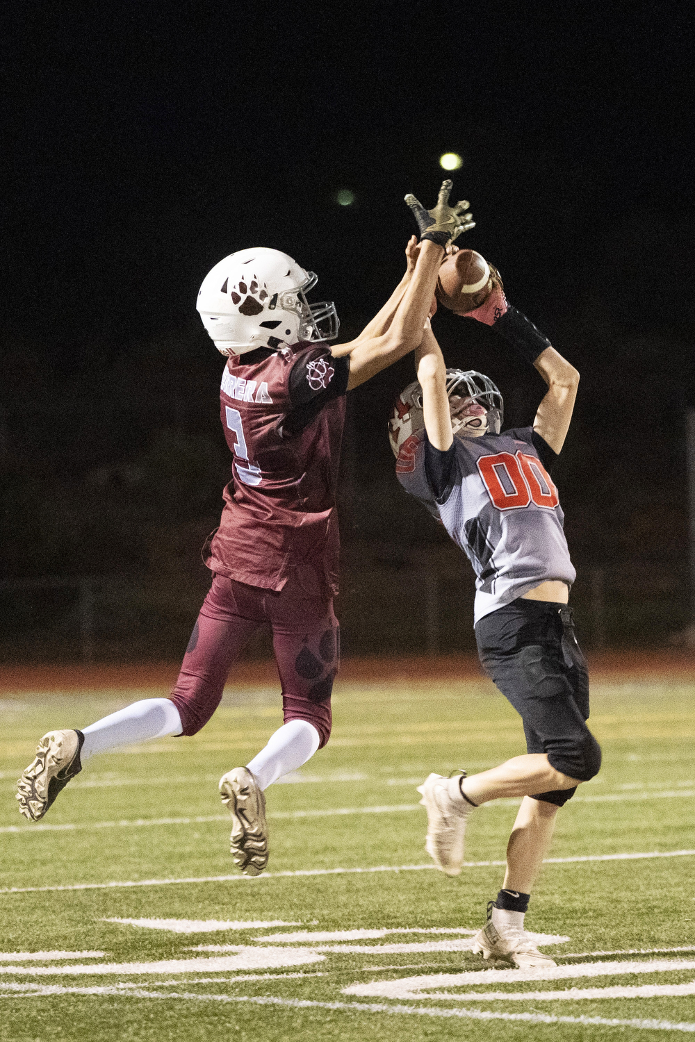 Marauders Calin Christopher (no. 00) intercepts a pass to Coyotes Malakai Herrera (no. 3) during the Northern Arizona Youth Football Majors championship between Camp Verde Coyotes and Mingus Mountain Marauders at Sedona Red Rock High School on Saturday, Nov. 8.