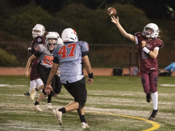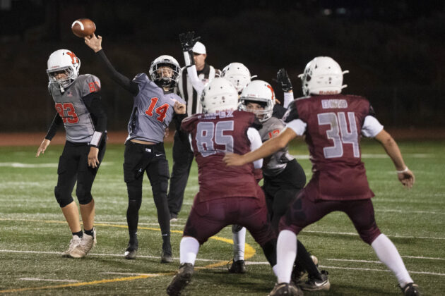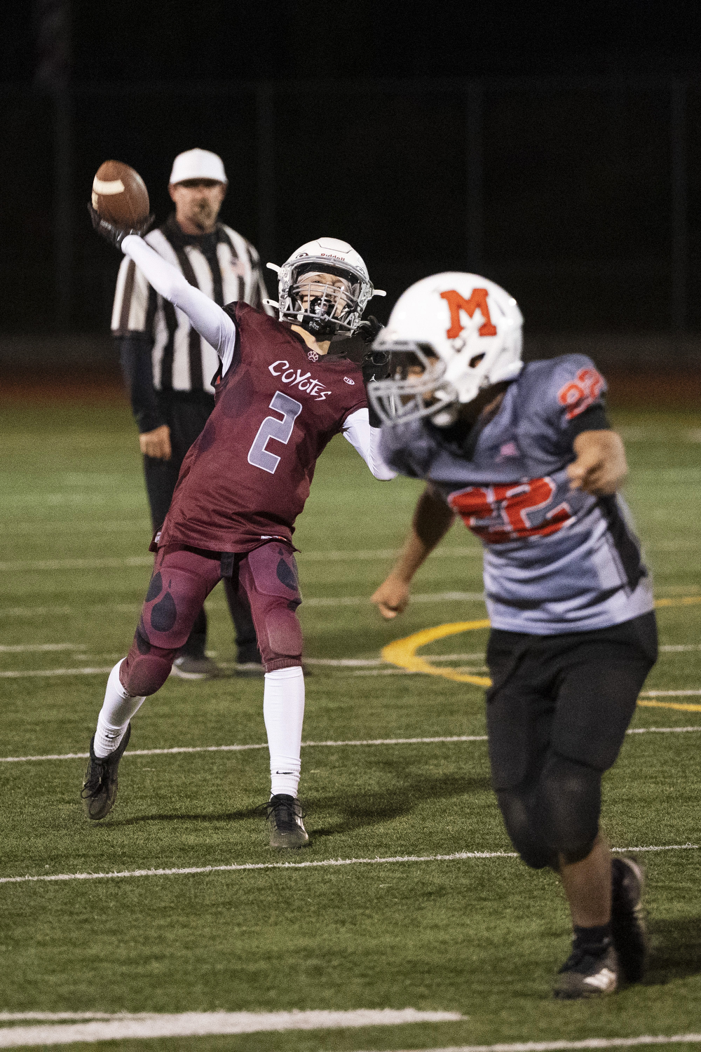 Coyotes Chaz Ozuna Jr. (no. 8) passes the ball during the Northern Arizona Youth Football Majors championship between Camp Verde Coyotes and Mingus Mountain Marauders at Sedona Red Rock High School on Saturday, Nov. 8.