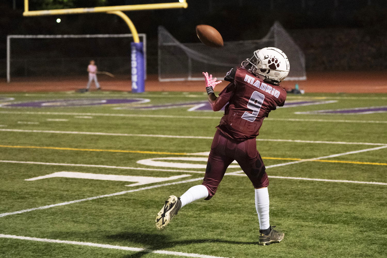 Coyotes Isaac Madrid (no. 9) catches a pass and runs it in for a touchdown during the Northern Arizona Youth Football Majors championship between Camp Verde Coyotes and Mingus Mountain Marauders at Sedona Red Rock High School on Saturday, Nov. 8.