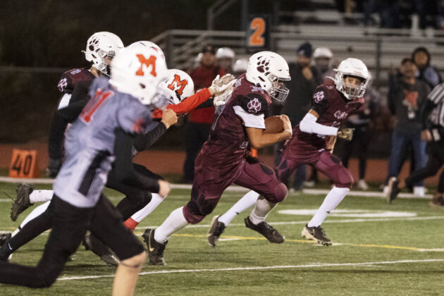 Coyotes Chase Bird (no. 34) runs the ball during the Northern Arizona Youth Football Majors championship between Camp Verde Coyotes and Mingus Mountain Marauders at Sedona Red Rock High School on Saturday, Nov. 8.