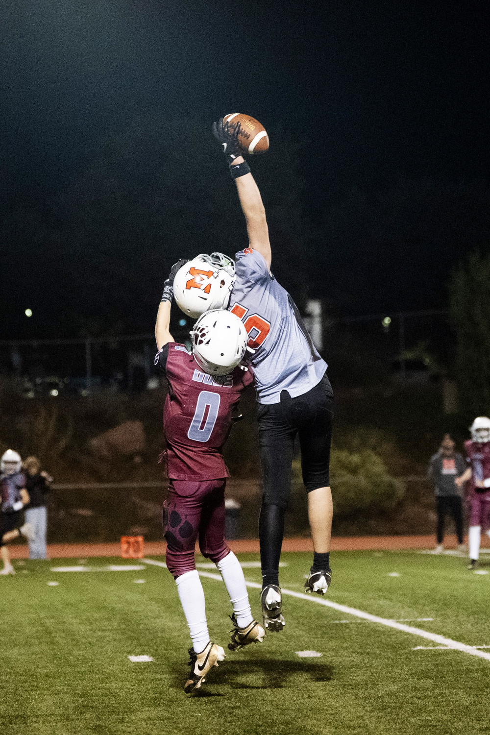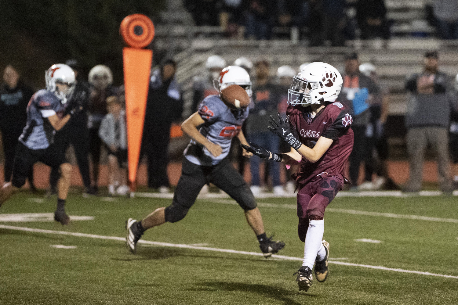 Coyotes Kayden Dubs (no. 0) catches a pass during the Northern Arizona Youth Football Majors championship between Camp Verde Coyotes and Mingus Mountain Marauders at Sedona Red Rock High School on Saturday, Nov. 8.