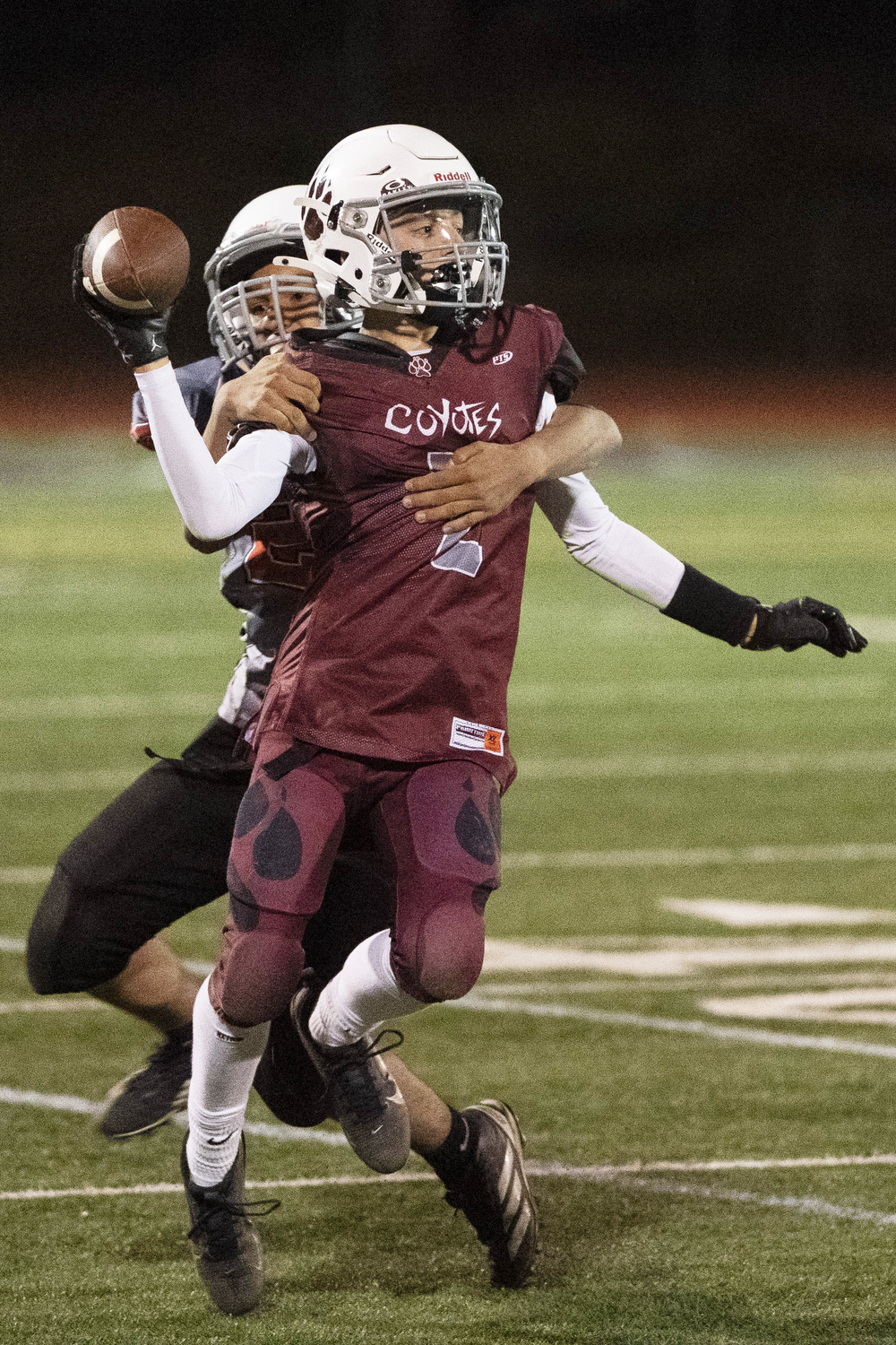 Coyotes Kaycen Dubs (no. 2) is wrapped up by Marauders Alfredo (Freddy) Milan (no. 22) before throwing the ball during the Northern Arizona Youth Football Majors championship between Camp Verde Coyotes and Mingus Mountain Marauders at Sedona Red Rock High School on Saturday, Nov. 8.