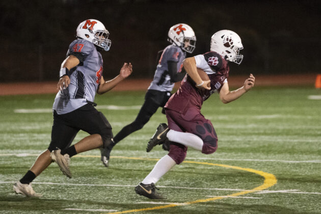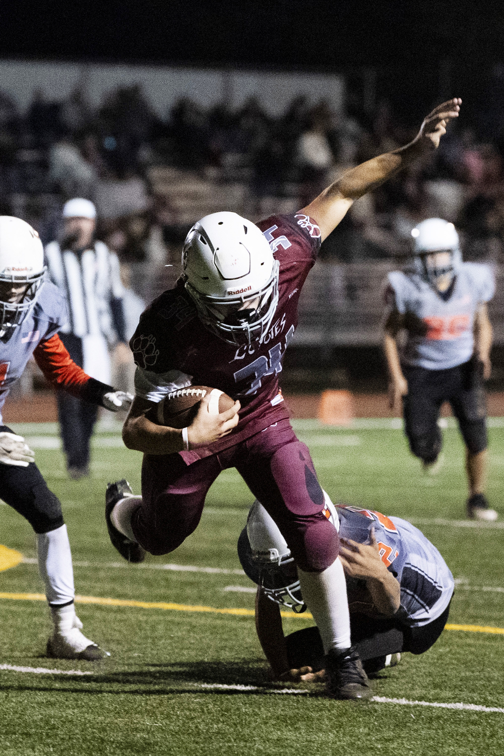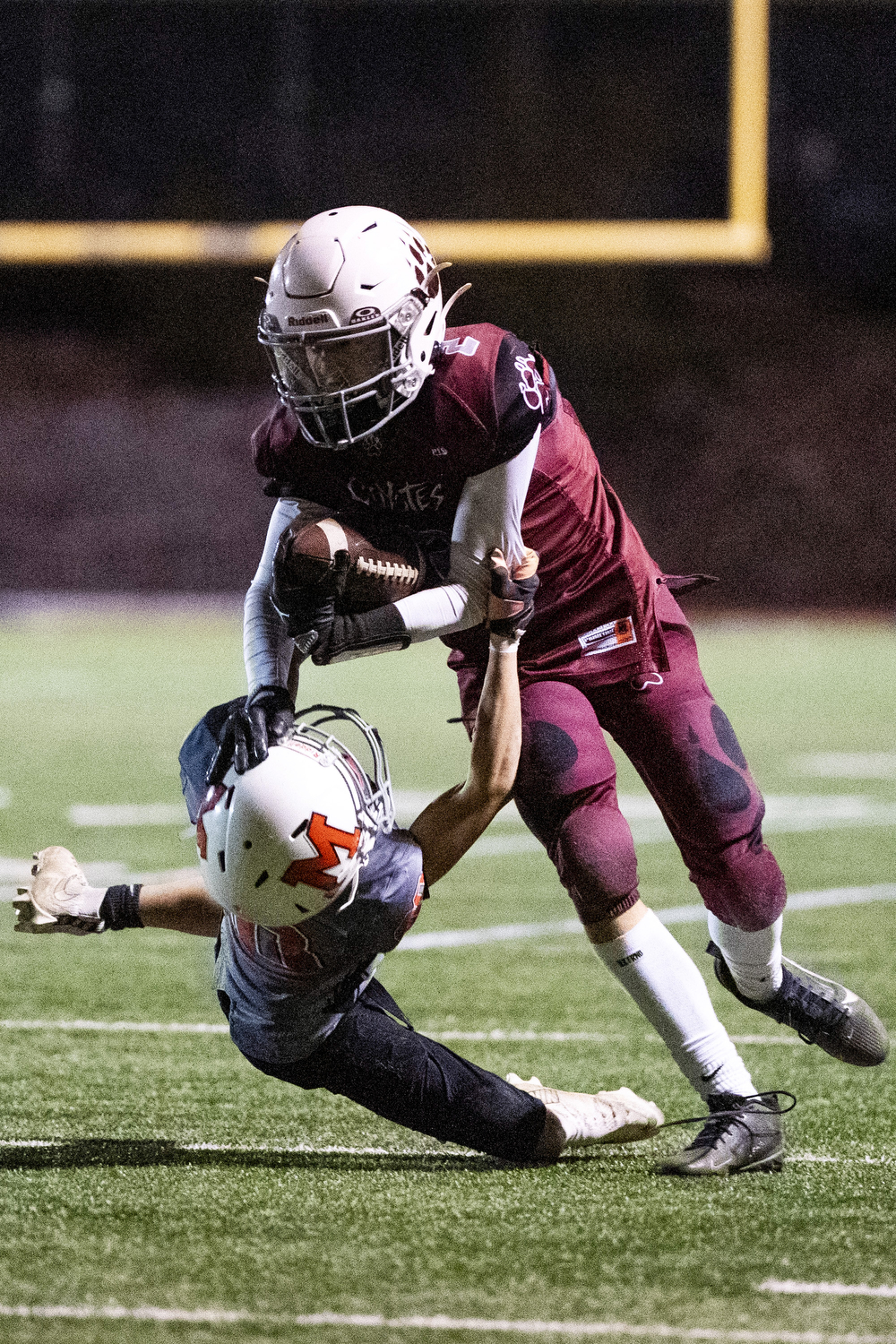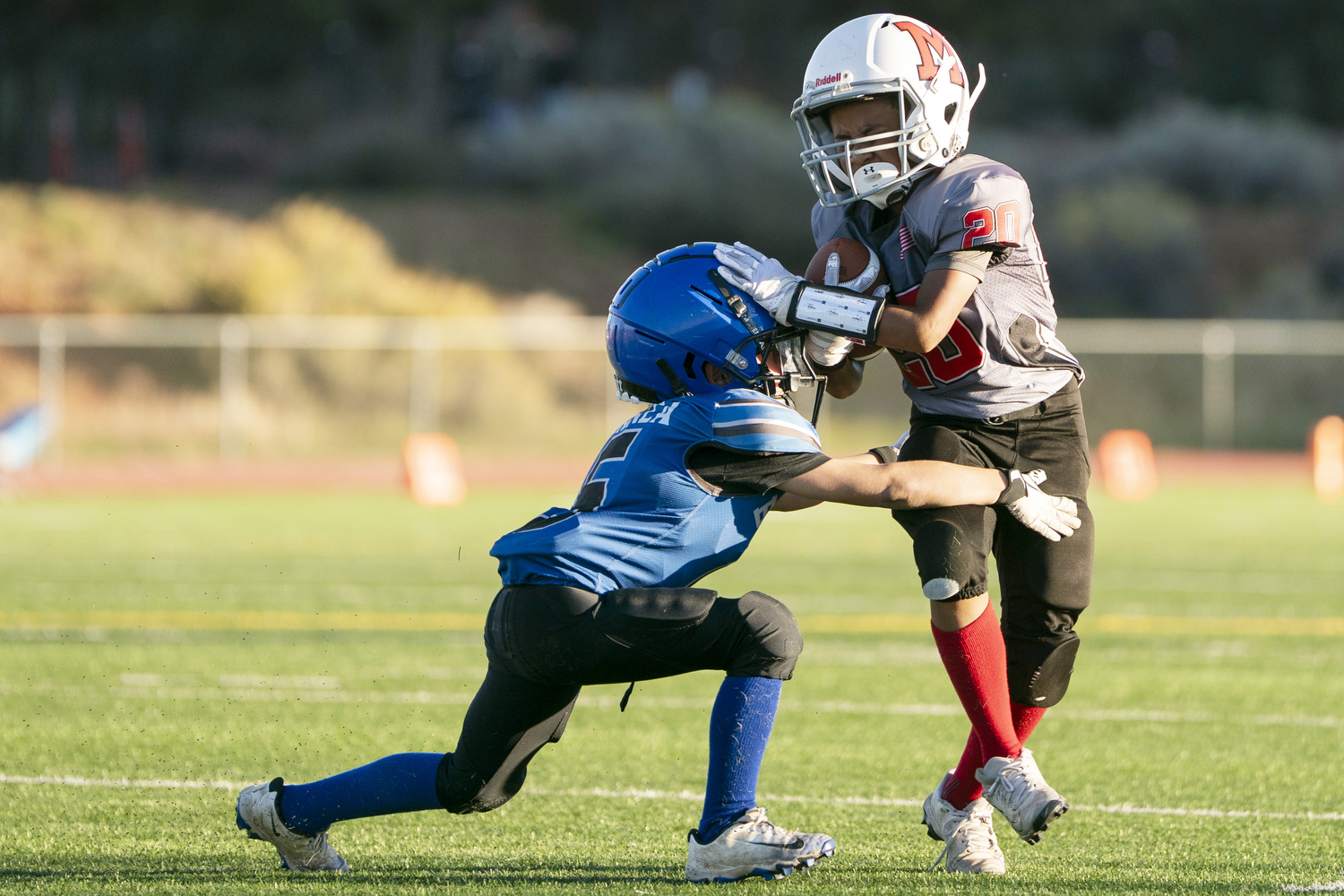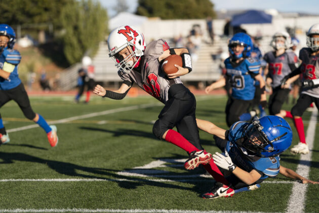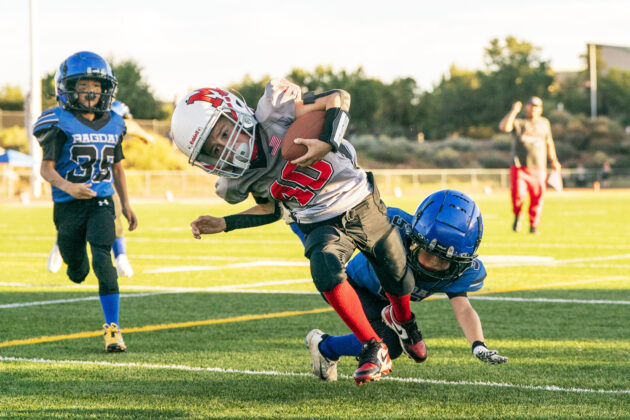 Coyotes Chase Bird (no. 34) is tripped up by Marauders Alfredo (Freddy) Milan (no. 22) during the Northern Arizona Youth Football Majors championship between Camp Verde Coyotes and Mingus Mountain Marauders at Sedona Red Rock High School on Saturday, Nov. 8.