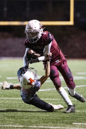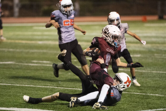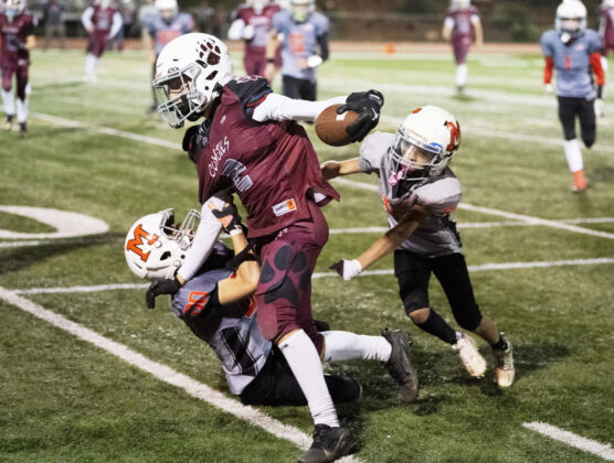 Coyotes Kayden Dubs (no. 0) is pulled down by Marauders Noah Midkiff (no. 11) during the Northern Arizona Youth Football Majors championship between Camp Verde Coyotes and Mingus Mountain Marauders at Sedona Red Rock High School on Saturday, Nov. 8.