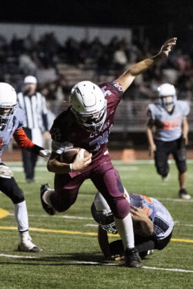 Coyotes Kaycen Dubs (no. 2) is pulled down by Marauders Calin Christopher (no. 00) during the Northern Arizona Youth Football Majors championship between Camp Verde Coyotes and Mingus Mountain Marauders at Sedona Red Rock High School on Saturday, Nov. 8.