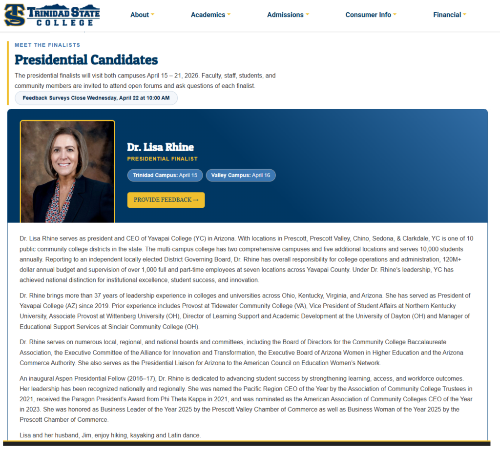 But perhaps Rhine was just in a rush, considering she also stated in the email that she would be out of the office from April 13 to 17. “Why was she out?” you ask. Rhine is looking for other work. She’s one of three candidates to become the new president of Trinidad State College and meet with students, faculty and other stakeholders in Trinidad, Colorado, on April 15. Rhine appears to see the writing on the wall should McCasland be replaced as it signals the board may be done with her, too.